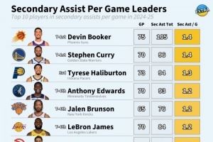 体育资讯9月28日讯 今天,数据媒体Extra列出了24-25赛季场均间接助攻(助攻传球之前的那次传球)前10,具体为: