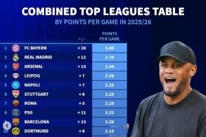 - 2025-10-28本赛季五大联赛积分榜:皇马10场27分居首,拜仁8场全胜24分次席
