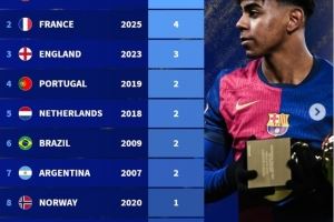 体育资讯11月5日讯 巴黎圣日耳曼小将杜埃赢得了2025年金童奖,德转盘点了各国球员赢得金童奖次数,西班牙以5次居首。
