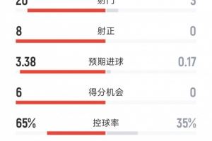 切尔西3-0狼队全场数据:射门20-3,射正8-0,得分机会6-0