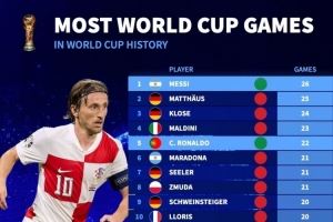 世界杯历史出场排名:梅西26场最多,C罗22场、莫德里奇19场