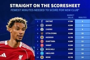 - 2025-10-08今夏新援最快攻入首球排名:埃基蒂克4分钟居首,博尼5分钟次席